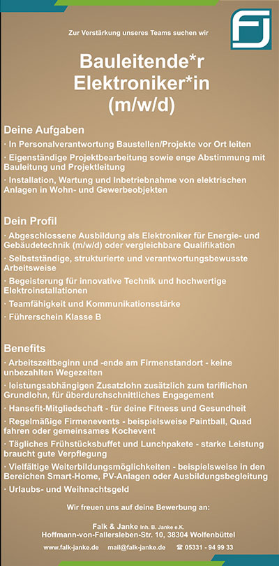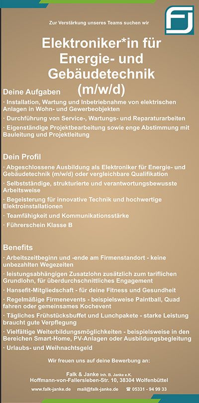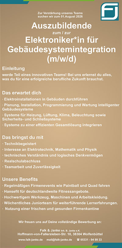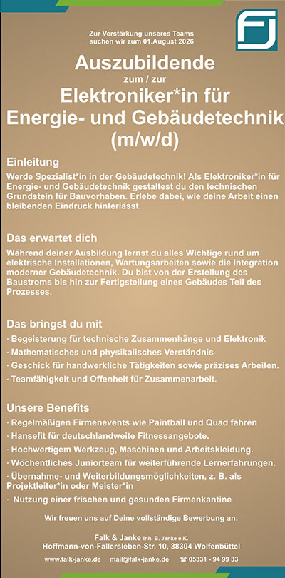 Parallel zu seinen 40 fest angestellten Mitarbeitern, bietet Falk & Janke jedes Jahr rund 5 Ausbildungsplätze an. Junge Menschen haben hierdurch die Möglichkeit sich zum Beispiel zum Elektroniker/ in Energie- und Gebäudetechnik oder Kaufmann/ Kauffrau für Büromanagement zu qualifizieren. Berufe, denen die Zukunft gehört. Integriert in das Ausbildungskonzept von Falk & Janke ist Spaß an der Arbeit und Eigenverantwortung durch Ausbildungsprojekte im Rahmen des Juniorteams zu übernehmen.